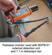 白俄羅斯ATOMTEX AT1125B 為一款輻射檢測(cè)儀,用于測(cè)量γ輻射劑量及劑量率,外接探頭BDPB-01與主機(jī)連接后,還可測(cè)量β表面沾污及放射性核素的活度。該款輻射檢測(cè)儀能夠用于搜查放射源、檢測(cè)廢金屬等。儀器內(nèi)置 NaI(TI)閃爍體探測(cè)器,可快速*地對(duì)較小的輻射改變做出響應(yīng)。 此外,儀器的校正功能(能量范圍 0.05...3MeV),使得儀器的劑量率測(cè)量更加*。BDPB-01 帶有 1.7m 延長(zhǎng)桿, 使得測(cè)量非常方便。
